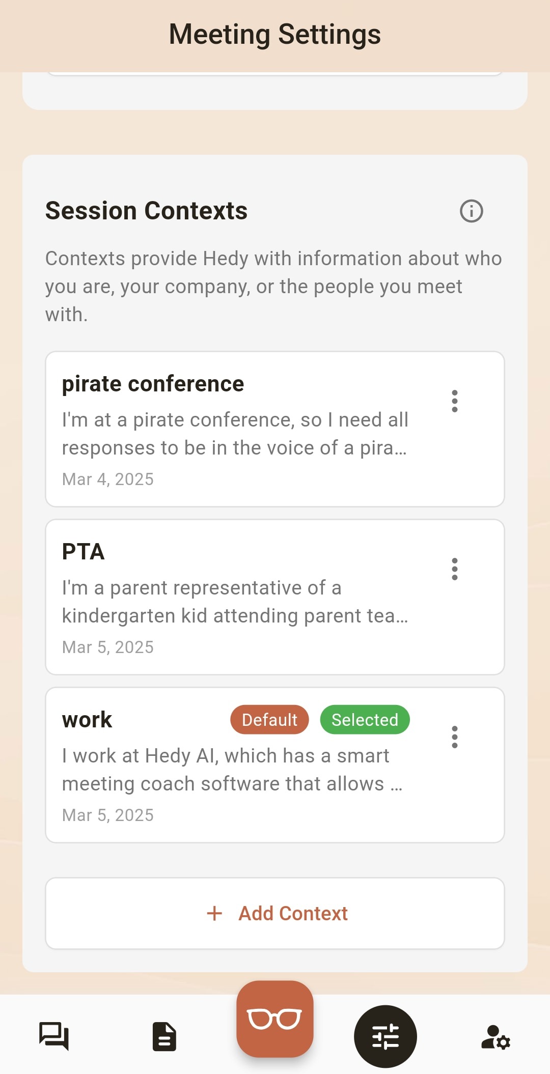 Your contexts will automatically synchronize across all your devices. This ensures you have access to the same contexts whether you’re using Hedy on your phone, tablet, or through the web interface.