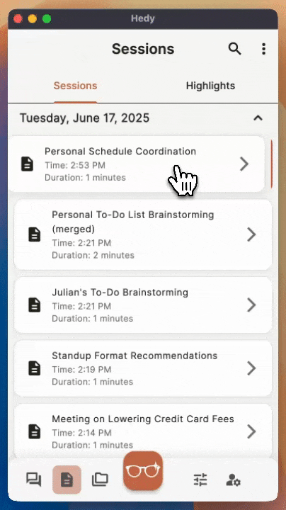 Session management in Hedy helps you organize your recorded conversations and meetings. You can rename sessions, assign them to topics, search through content, and perform bulk operations to keep your workspace tidy and efficient.