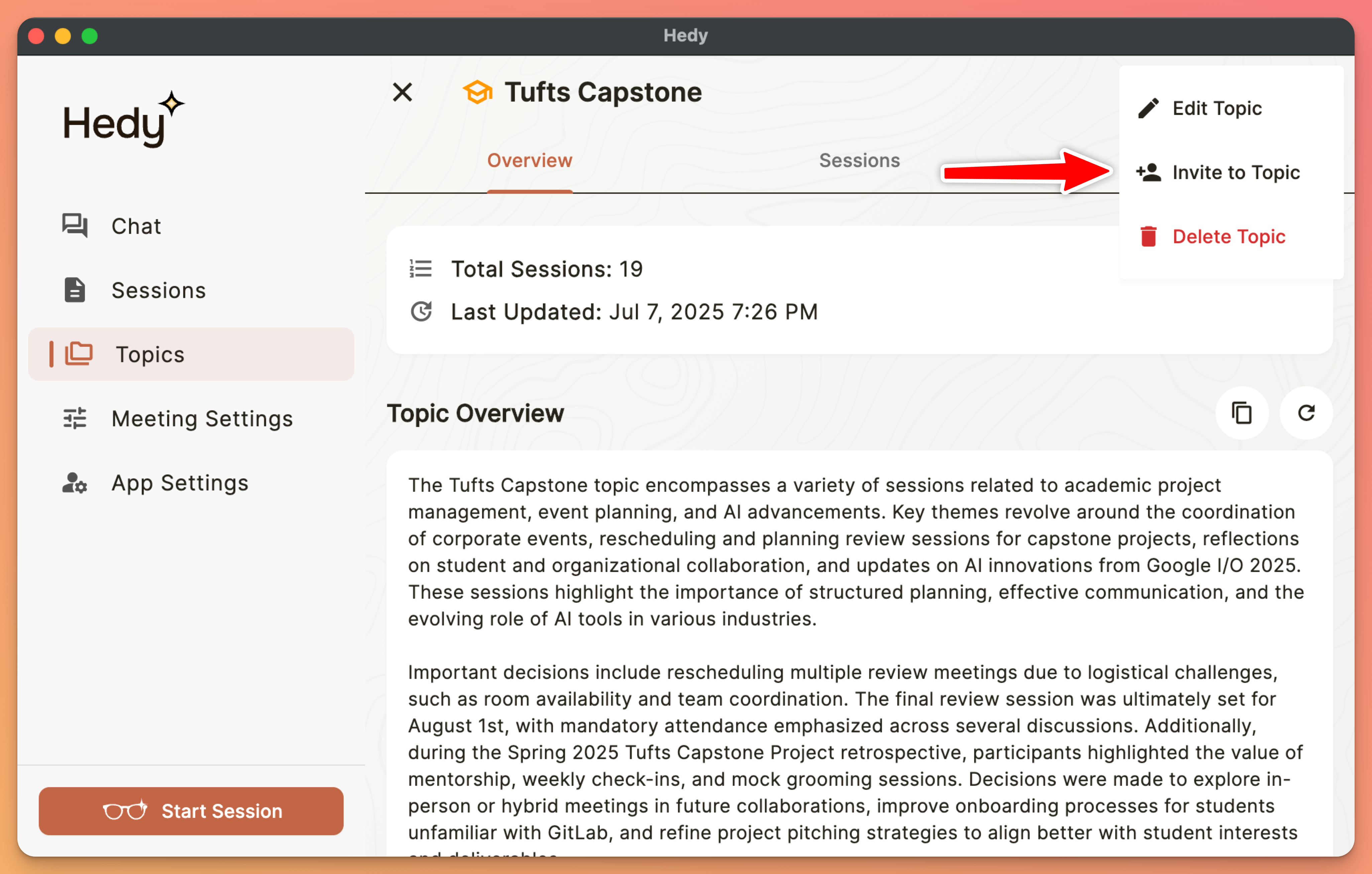 Note: When you share a topic, recipients get access to all sessions within it, including any new sessions you add later to that topic.