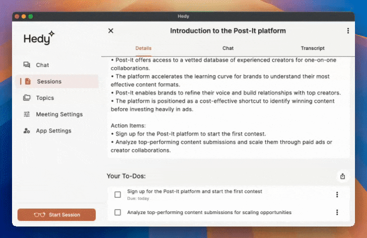 Hedy automatically identifies and extracts action items from your conversations, creating a organized to-do list for each session. These aren’t just transcribed tasks - Hedy’s AI understands context, assigns tasks to the right people, and can even suggest due dates. Pro users can export these todos to external tools like Todoist, Notion, or any task manager via Zapier integration.